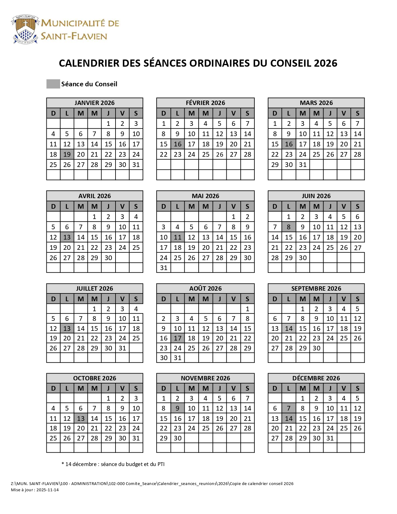 Dates des séances ordinaires du Conseil pour l'année 2026
