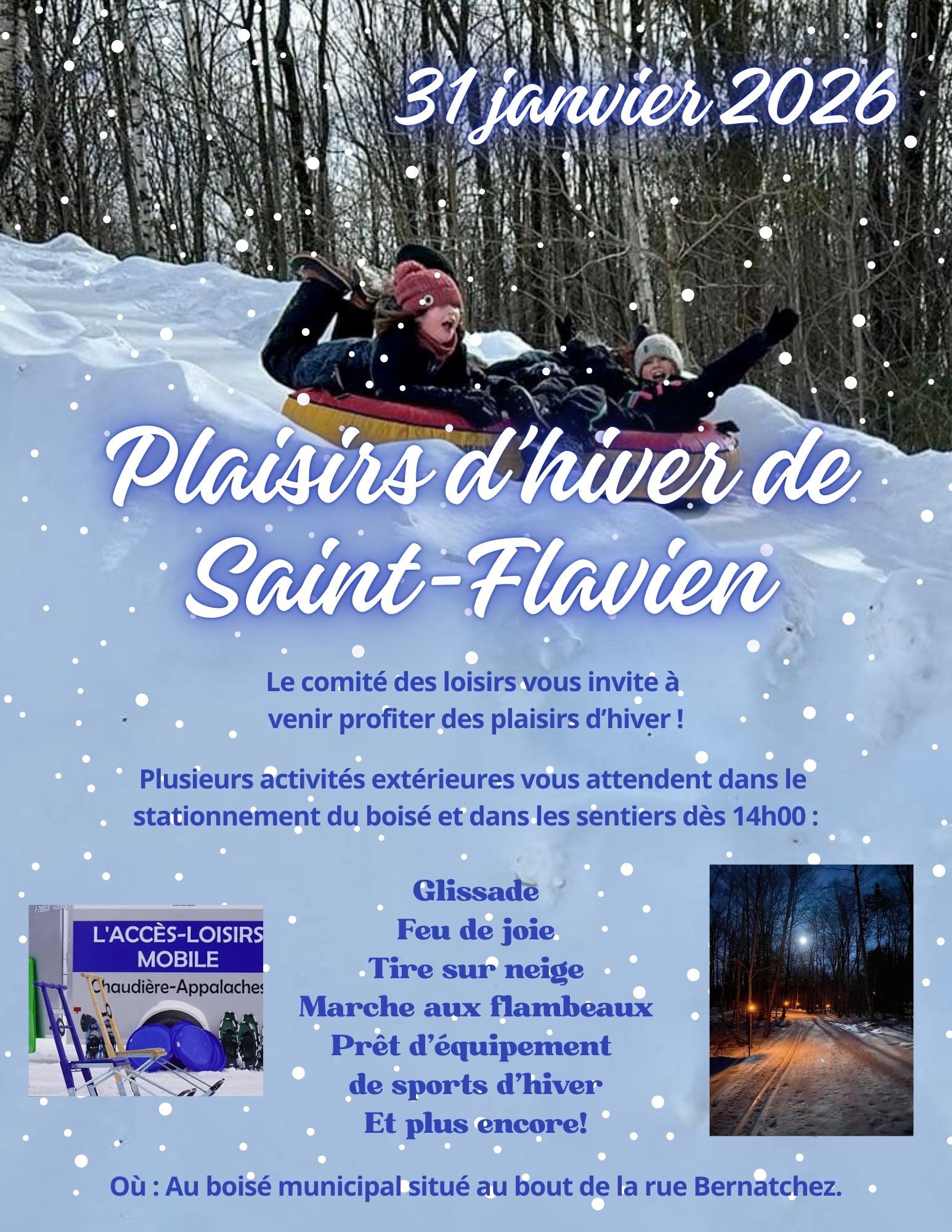 Le comité des loisirs vous invite encore à passer une magnifique journée à l'extérieur, le samedi 31 janvier 2026 dans le cadre des Plaisirs d'hiver de Saint-Flavien. Soyez des nôtres!